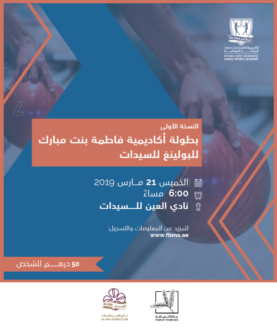 تتشرف أكاديمية فاطمة بنت مبارك بدعوة جميع السيدات من هواة ومحترفات البولينغ للمشاركة في النسخة الأولى من بطولة أكاديمية فاطمة بنت مبارك للبولينغ للسيدات الغنية بالمنافسة والمرح، وذلك يوم الخميس 21 مارس في نادي العين للسيدات في مدينة العين. لا تفوتوا فرصة المشاركة في هذه الفعالية الأولى من نوعها لاستعراض مهاراتكن في تقنيات البولينغ الفريدة!